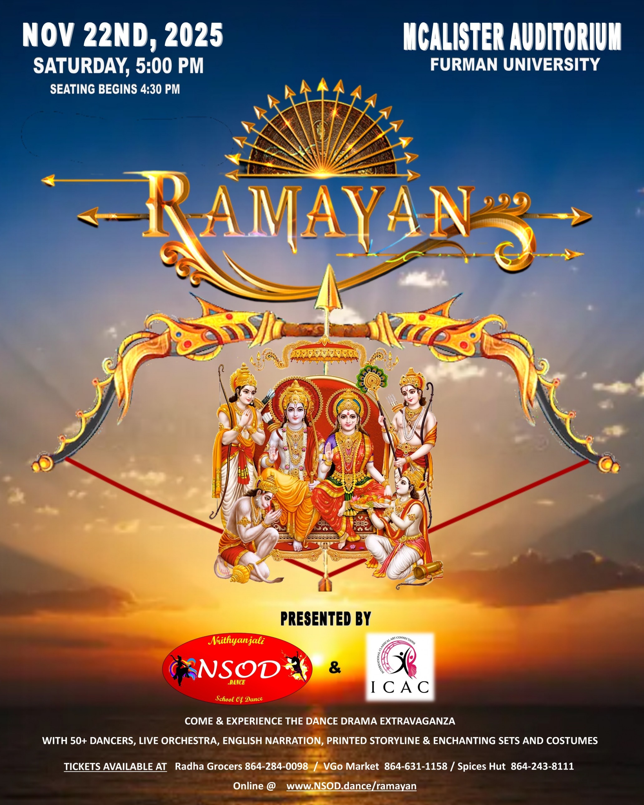 ICAC & NSOD is proud to host a spectacular cultural event that brings to life one of the greatest epics of all time. 'RAMAYAN', a grand Bharatanatyam dance drama, promising an unforgettable evening of storytelling, music, and visual splendor.